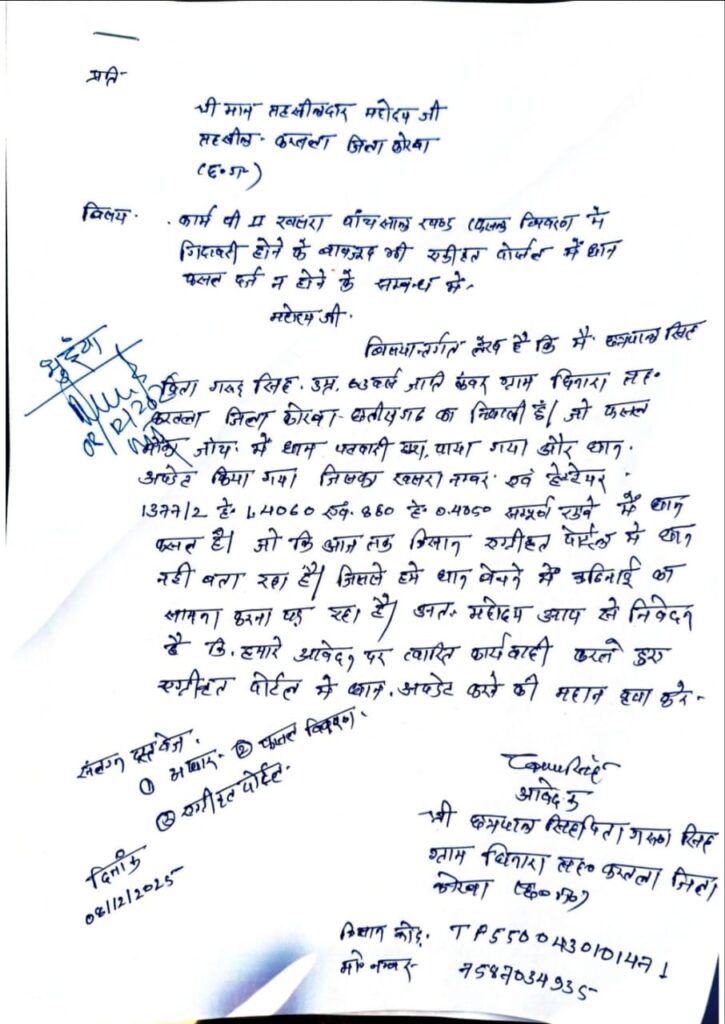 कोरबा,09 दिसंबर (वेदांत समाचार)।किसानों को हितैषी बताने वाली राज्य सरकार किसान समस्याओं के समाधान को लेकर कितनी गंभीर है, इसका अंदाज़ा करतला तहसील के किसानों की स्थिति देखकर लगाया जा सकता है। धान बेचने के लिए किसानों को लगातार तहसील के चक्कर लगाने पड़ रहे हैं, लेकिन तहसीलदार से लेकर पटवारी और राजस्व विभाग के अधिकारी तक किसी भी स्तर पर समस्या के समाधान के लिए तैयार नहीं दिख रहे। गिरदावरी में हुई भारी त्रुटि ने किसानों की परेशानियों को और बढ़ा दिया है।