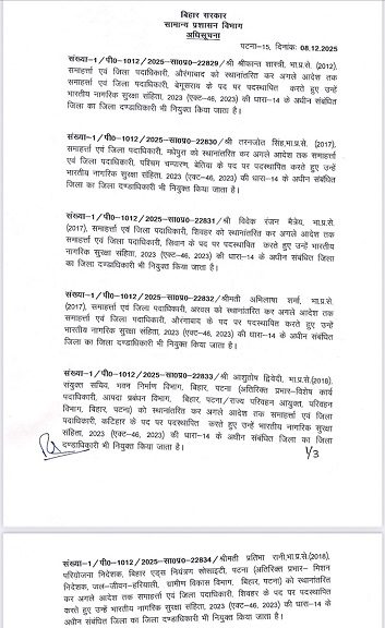 आशुतोष द्विवेदी, भा.प्र.से. (2018 ). संयुक्त सचिव भवन निर्माण विभाग, बिहार, पटना ( अतिरिक्त प्रभार- विशेष कार्य पदाधिकारी, आपदा प्रबंधन विभाग, बिहार, पटना / राज्य परिवहन आयुक्त, परिवहन विभाग, बिहार, पटना) को स्थानांतरित कर अगले आदेश तक समाहर्त्ता एवं जिला पदाधिकारी, कटिहार के पद पर पदस्थापित करते हुए उन्हें भारतीय नागरिक सुरक्षा संहिता, 2023 (एक्ट-46 2023) की धारा-14 के अधीन संबंधित जिला का जिला दण्डाधिकारी भी नियुक्त किया जाता है।