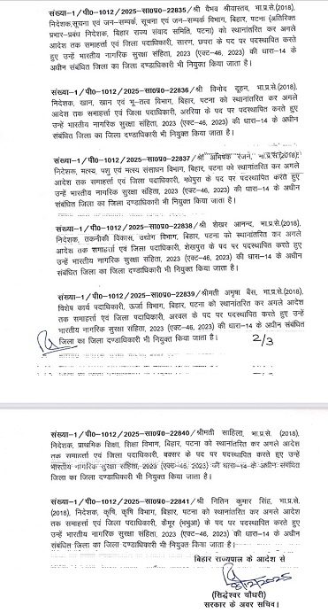 नितिन कुमार सिंह, भा.प्र.से. (2018), निदेशक, कृषि, कृषि विभाग, बिहार, पटना को स्थानांतरित कर अगले आदेश तक समाहर्त्ता एवं जिला पदाधिकारी, कैमूर (भभुआ) के पद पर पदस्थापित करते हुए उन्हें भारतीय नागरिक सुरक्षा संहिता, 2023 (एक्ट-46, 2023) की धारा-14 के अधीन संबंधित जिला का जिला दण्डाधिकारी भी नियुक्त किया जाता है।