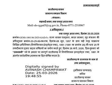 रामनवमी 2026: छत्तीसगढ़ में आज 26 मार्च को सार्वजनिक अवकाश घोषित, सभी सरकारी दफ्तर रहेंगे बंद
