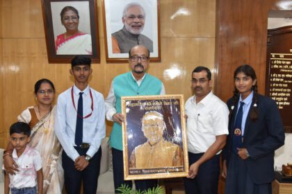 राज्यपाल श्री डेका को मड़ानार स्कूल के बच्चों ने काष्ठ कला से निर्मित पोट्रेट भेंट की