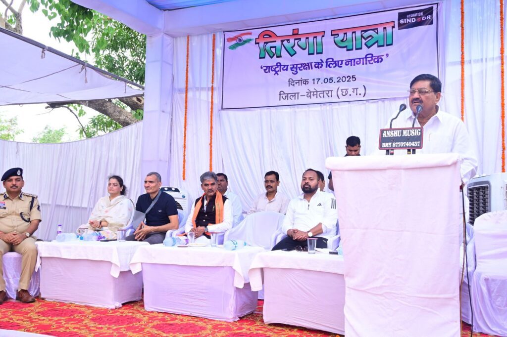 बेमेतरा, 17 मई (वेदांत समाचार)। आज दिनांक 17 मई 2025 को बेमेतरा जिले में “राष्ट्रीय सुरक्षा के लिए नागरिक” के बैनर तले एक भव्य तिरंगा यात्रा का आयोजन किया गया। इस तिरंगा यात्रा का नेतृत्व राज्य के खाद्य, नागरिक आपूर्ति एवं उपभोक्ता संरक्षण मंत्री दयालदास बघेल द्वारा किया गया। यात्रा प्रातः 08:00 बजे कृषि उपज मंडी से आरंभ होकर जयस्तंभ चौक तक निकाली गई।