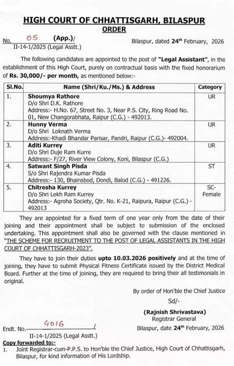 इसके साथ ही सभी मूल शैक्षणिक और अन्य आवश्यक प्रमाण पत्र भी प्रस्तुत करने होंगे। जिन अभ्यर्थियों की नियुक्ति विधिक सहायक के पद पर की गई है, उनमें शौम्या राठौर (न्यू चांगोराभाटा, रायपुर), हन्नी वर्मा (पंडरी, रायपुर), अदिति कुर्रे (कोनी, बिलासपुर), सतवंत सिंह (दोंदी, बालोद) और चित्रेशा कुर्रे (रायपुरा, रायपुर) शामिल हैं।