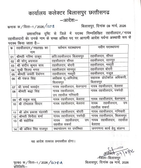 बिलासपुर,09 मार्च (वेदांत समाचार)। जिले में प्रशासनिक व्यवस्था को मजबूत करने के लिए बड़ा फेरबदल किया गया है। कलेक्टर संजय अग्रवाल ने तहसीलदार और नायब तहसीलदार स्तर के कुल 14 अधिकारियों का तबादला करते हुए नई पदस्थापना के आदेश जारी किए हैं।