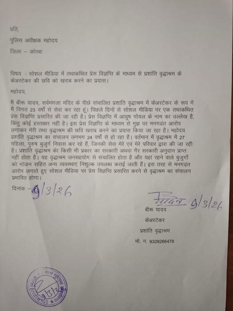 कोरबा, 09 मार्च (वेदांत समाचार)। प्रशांति वृद्धाश्रम को लेकर सोशल मीडिया पर एक तथाकथित प्रेस विज्ञप्ति जारी करने वाले व्यक्ति के खिलाफ कार्रवाई करने पुलिस अधीक्षक के समक्ष शिकायत प्रस्तुत की गई है।