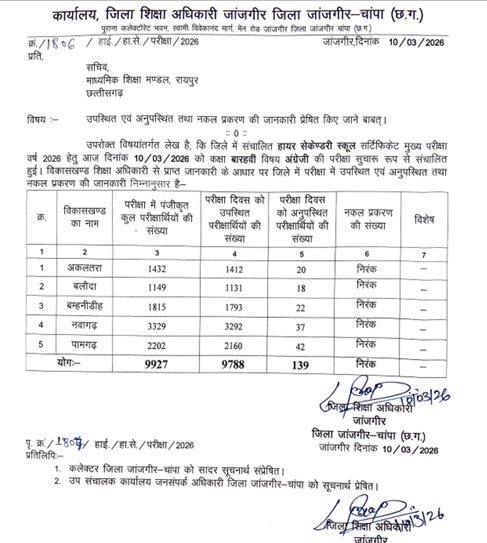 जांजगीर-चांपा 10 मार्च 2026/ जिले में संचालित हायर सेकेण्डरी स्कूल सर्टिफिकेट परीक्षा वर्ष 2026 हेतु आज कक्षा 12वीं विषय अंग्रेजी की परीक्षा सुचारू रूप से संचालित हुई। जिला शिक्षा अधिकारी ने बताया कि जिले में कुल 9927 दर्ज परीक्षार्थियों में से 9788 उपस्थित और 139 अनुपस्थित रहे। जिसमें विकासखंड अकलतरा में 1432 परीक्षार्थियों में से 1412 उपस्थित, 20 अनुपस्थित, बलौदा विकासखंड में 1149 परीक्षार्थियों में से 1131 उपस्थित, 18 अनुपस्थित, बम्हनीडीह विकासखंड में 1815 परीक्षार्थियों में से 1793 उपस्थित, 22 अनुपस्थित, नवागढ़ विकासखंड में 3329 परीक्षार्थियों में से 3292 उपस्थित, 37 अनुपस्थित, पामगढ़ विकासखंड में 2202 परीक्षार्थियों में से 2160 उपस्थित, 42 अनुपस्थित थे। परीक्षा में नकल प्रकरण दर्ज नहीं किए गए हैं।
