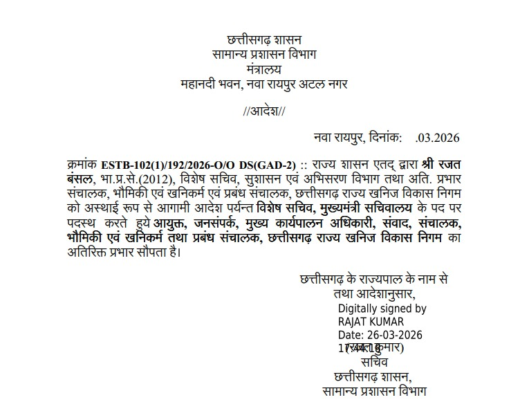 रायपुर,27 मार्च (वदंत समाचार) । छत्तीसगढ़ शासन ने प्रशासनिक स्तर पर महत्वपूर्ण फेरबदल करते हुए रजत बंसल को मुख्यमंत्री सचिवालय में विशेष सचिव के पद पर पदस्थ किया है। इसके साथ ही उन्हें आयुक्त जनसंपर्क, मुख्य कार्यपालन अधिकारी (संवाद), संचालक भौमिकी एवं खनिकर्म तथा प्रबंध संचालक, छत्तीसगढ़ राज्य खनिज विकास निगम की अतिरिक्त जिम्मेदारी दी गई है।