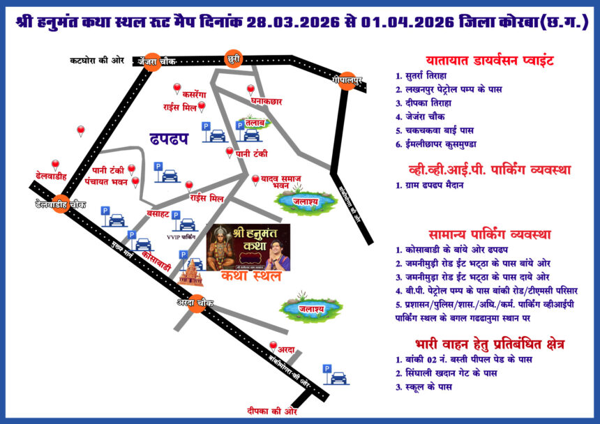 कोरबा, 27 मार्च (वेदांत समाचार)। जिले में आयोजित होने जा रहे श्री हनुमंत कथा कार्यक्रम को लेकर यातायात पुलिस ने विस्तृत रूटमैप जारी कर दिया है। यह विशेष ट्रैफिक व्यवस्था 28 मार्च 2026 से 1 अप्रैल 2026 तक लागू रहेगी, ताकि श्रद्धालुओं को आवागमन में सुविधा मिल सके और शहर में जाम की स्थिति न बने।