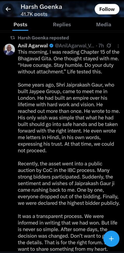 नई दिल्ली। वेदांता ग्रुप ने दिवालिया समूह ‘जयप्रकाश एसोसिएट्स’ (Jaiprakash Associates) को खरीदने के लिए बोली जीत ली थी लेकिन इसके बावजूद अधिग्रहण नहीं कर सके और यह कंपनी अडानी समूह के हाथों में चली गई। इस मुद्दे पर वेदांता के चेयरमैन अनिल अग्रवाल (Anil Agrawal) ने अपने मन की भड़ास निकाली। खास बात है कि मशहूर उद्योगपति हर्ष गोयनका (Harsh Goenka) ने उनका समर्थन किया। दरअसल, अनिल अग्रवाल ने कहा कि वेदांता समूह को जयप्रकाश एसोसिएट्स के लिए सबसे ऊंची बोली लगाने वाला घोषित किया गया था, लेकिन बाद में इस फैसले को पलट दिया गया। X पर एक पोस्ट में अनिल अग्रवाल ने कहा कि वेदांता “उचित माध्यमों” के जरिए अपना पक्ष रखेगी।