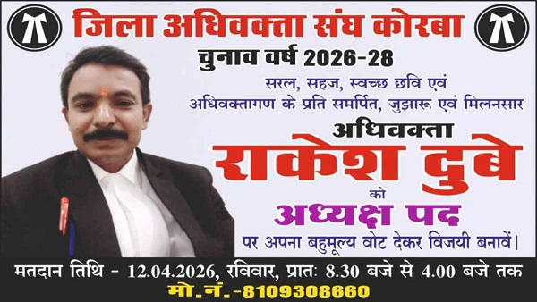 कोरबा, 30 मार्च (वेदांत समाचार)। जिला अधिवक्ता संघ कोरबा के आगामी चुनाव (कार्यकाल 2026–28) को लेकर चुनावी सरगर्मी तेज हो गई है। इसी क्रम में अधिवक्ता राकेश दुबे ने अध्यक्ष पद के लिए अपनी उम्मीदवारी प्रस्तुत की है और अधिवक्ताओं से समर्थन की अपील की है।