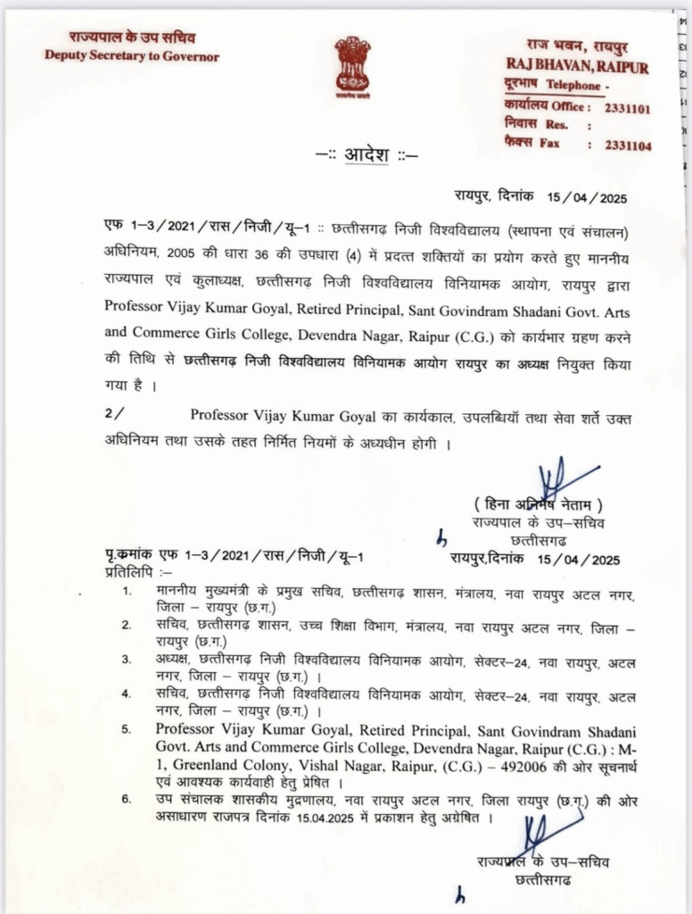 रायपुर। छत्तीसगढ़ में निजी विश्वविद्यालयों के संचालन और निगरानी के लिए गठित छत्तीसगढ़ निजी विश्वविद्यालय विनियामक आयोग को नया अध्यक्ष मिल गया है. राज्यपाल एवं कुलाधिपति के आदेशानुसार प्रोफेसर विजय कुमार गोयल को आयोग का नया अध्यक्ष नियुक्त किया गया है. इस संबंध में राजभवन से आज आदेश जारी किया गया है.