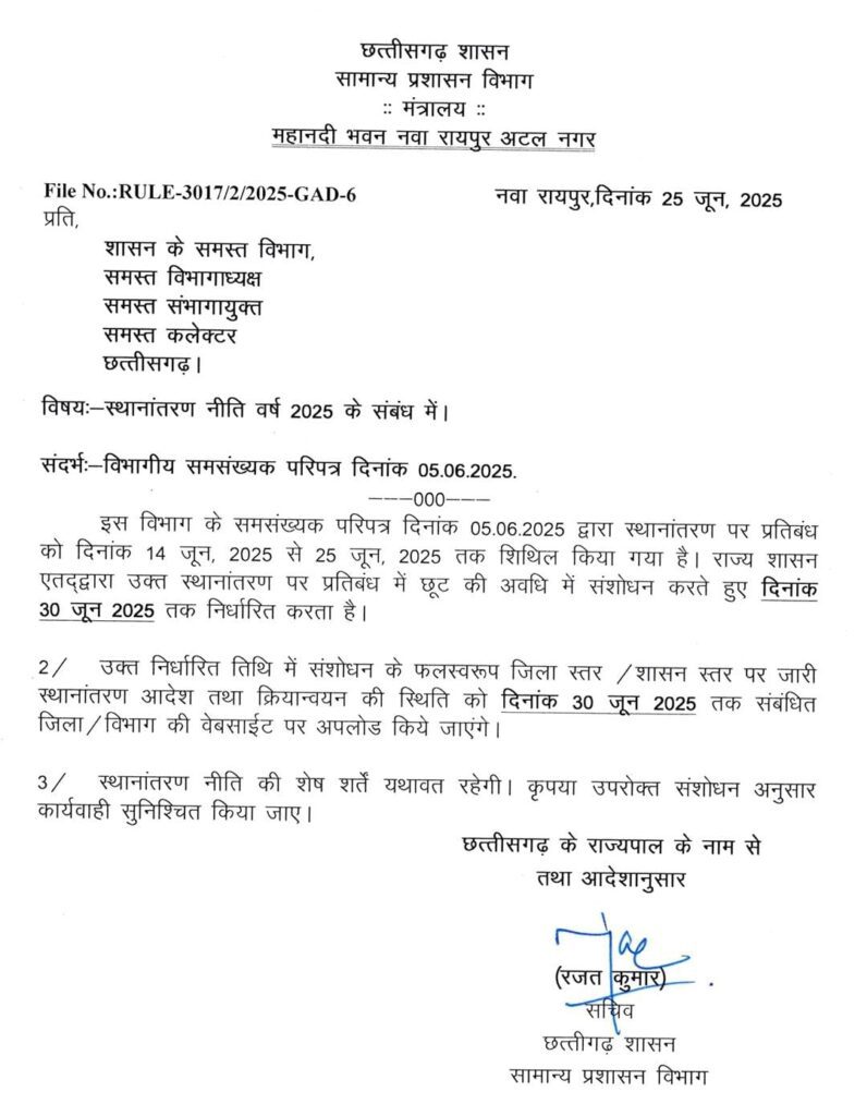 Chhattisgarh Government: इस संबंध में सामान्य प्रशासन विभाग की ओर से जारी पत्र में बताया गया है कि स्थानांतरण नीति वर्ष 2025 के तहत स्थानांतरण पर प्रतिबंध को 25 जून तक शिथिल किया गया था, जिसे अब 30 जून तक बढ़ा दिया गया है।