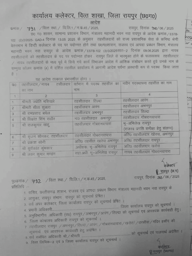 रायपुर, 30 जून (वेदांत समाचार)। रायपुर जिले में पदस्थ कई तहसीलदारों का तबादला किया गया है। जारी आदेश के अनुसार 9 तहसीलदारों को नई पदस्थापना मिली है। यह प्रशासनिक फेरबदल रायपुर कलेक्टर के निर्देशानुसार किया गया, जिसका उद्देश्य विभागीय कार्यों में स्वच्छता और त्वरित निपटान सुनिश्चित करना है। आदेश तत्काल प्रभाव से लागू है।
