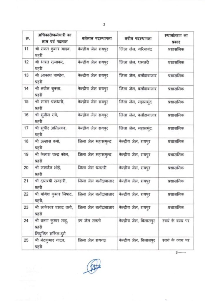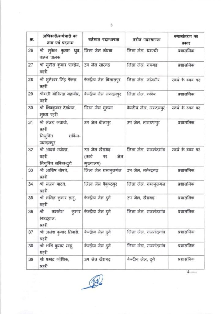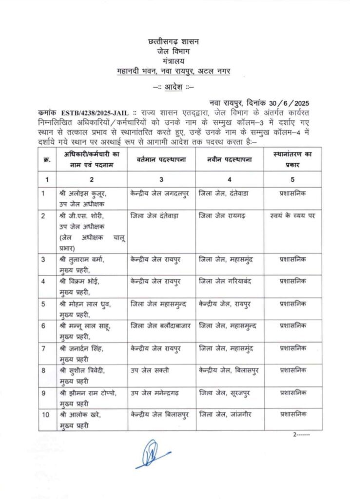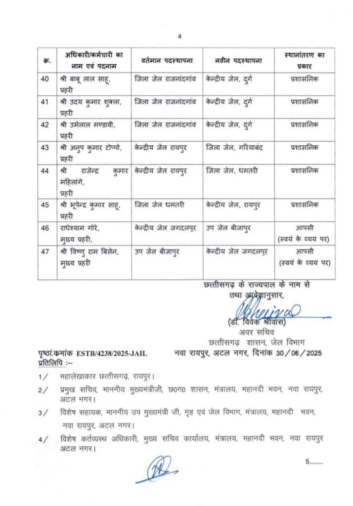 रायपुर। छत्तीसगढ़ की राजधानी रायपुर से बड़ी प्रशासनिक खबर सामने आई है। जेल प्रशासन विभाग द्वारा एक अहम निर्णय लेते हुए कई पुलिस कर्मियों और अधिकारियों का तबादला आदेश जारी किया गया है। जारी सूची में केंद्रीय जेल रायपुर समेत अन्य उप जेलों में कार्यरत अधिकारी-कर्मचारी शामिल हैं। प्रशासनिक आवश्यकताओं और विभागीय संतुलन को ध्यान में रखते हुए इन तबादलों को अंजाम दिया गया है। सूत्रों से मिली जानकारी के अनुसार, यह तबादले कार्यक्षमता, प्रशासनिक आवश्यकता और गतिविधियों की समीक्षा के आधार पर किए गए हैं। जेल मुख्यालय द्वारा जारी आदेश के अनुसार कुछ उप अधीक्षकों, हेड वार्डन, वार्डन, क्लर्क समेत अन्य कर्मचारियों को नवीन पदस्थापना स्थल पर जल्द कार्यभार ग्रहण करने के निर्देश दिए गए हैं। रायपुर, बिलासपुर, दुर्ग, जगदलपुर, आदि जिलों की जेलों में आपसी अदला-बदली भी की गई है।