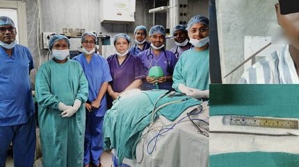 जिसकी कुल लम्बाई 17.5 से.मी. थी। गले में यह औजार मुख्य खून की नलियों के बीच से होता हुआ स्पाईनल कार्ड (पैरास्पाइनल स्पेस) के बहुत ही करीब जाकर धंसा था। बतौर ई.एन.टी. विभागाध्यक्ष मेरे नेतृत्व में डॉ. दुर्गेश गजेन्द्र, डॉ. अंकुर कुमार चन्द्राकर, डॉ. प्रियंका साहू (पी.जी. छात्र) एवं एनीस्थिसिया विभाग से डॉ. प्रतिभा जैन शाह, डॉ. अमृता एवं डॉ. नीरज (पी.जी. छात्र) द्वारा यह जटिल सर्जरी की गई। इस विशेष प्रकार की सर्जरी में लार ग्रंथि (पैरोटिड टिश्यू) को अपनी जगह से हटाकर और ग्रंथि के अंदर से होकर जाने वाली चेहरे की नस (फेशियल नर्व) के बीच से जाकर औजार को बड़ी बारीकी से निकाला गया। औजार का किनारा गले की मुख्य खून की नलियों के बिल्कुल नजदीक होने के कारण यह सर्जरी अत्यंत जटिल थी। अंततः सारी सावधानियों को ध्यान में रखते हुए औजार के आखिरी हिस्से को जो कि स्पाइनल कार्ड और स्पाइनल नसों के पास था,