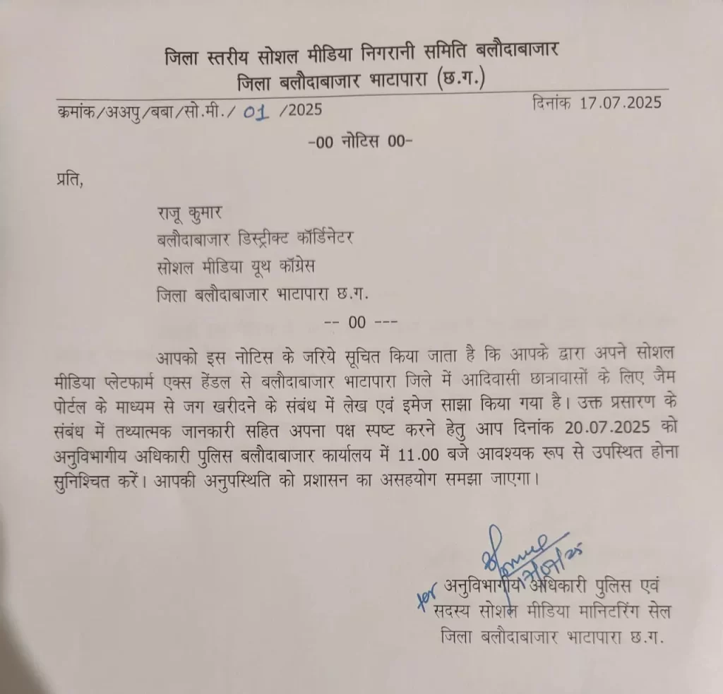 प्राप्त जानकारी के अनुसार बलौदाबाजार निवासी सोशल मीडिया यूथ कांग्रेस के डिस्ट्रिक्ट कोऑर्डिनेटर राजू कुमार द्वारा अपने सोशल मीडिया प्लेटफार्म एक्स एवं साजा भिलाई, जिला दुर्ग निवासी डिजिटल क्रिएटऱ सितम बंजारे के द्वारा अपने फेसबुक हैंडल से बलौदाबाजार भाटापारा जिले में आदिवासी छात्रावासों के लिए जैम पोर्टल के माध्यम से जग खरीदने के सम्बन्ध में लेख एवं इमेज़ साझा किया गया है।उक्त प्रसारण के सम्बन्ध में तथ्यात्मक जानकारी सहित अपना पक्ष रखने हेतु 20 जुलाई 2025 क़ो अनुविभागीय अधिकारी पुलिस बलौदाबाजार कार्यालय में प्रातः 11 बजे उपस्थित होने हेतु नोटिस जारी किया गया है।