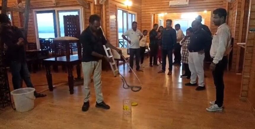 जिसके कारण पर्यटन डरे हुए हैं जिस पर जितेंद्र सारथी ने थोड़ी देर में टीम को भेजने की बात कही तब तक नजर रखने को कहा साथ ही दूरी बनाए रखने को भी कहा आखिरकार कुछ घंटों बाद रेस्क्यु टीम के सदस्य राकेश और राजू सतरंगा पहुंचे और बड़ी सावधानी से सांप को AC से बाहर निकाला साथ ही सभी को बताया गया कि यह सांप common cat snake हिंदी में सामान्य बिल्ली सांप कहते हैं फिर सुरक्षित रेस्क्यू किया गया तब जाकर लोगों ने राहत भरी सांस लिया और रेस्क्यु टीम का धन्यवाद ज्ञापित किया , जिसके बाद उसे जंगल में छोड़ दिया गया।