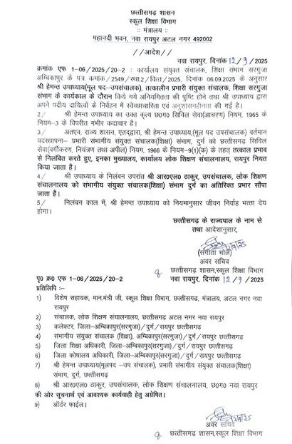 निलंबन आदेश शुक्रवार (12 सितंबर) को जारी किया गया। इसमें स्पष्ट किया गया है कि हेमंत उपाध्याय को तत्काल प्रभाव से डीपीआई (निदेशक, लोक शिक्षण संचालनालय) में अटैच किया जा रहा है। नए शिक्षा मंत्री गजेंद्र यादव के कार्यभार संभालने के बाद यह उनकी पहली बड़ी कार्रवाई मानी जा रही है।