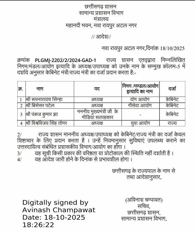 रायपुर, 18 अक्टूबर। मुख्यमंत्री साय सरकार ने शनिवार को बड़ा प्रशासनिक फैसला लेते हुए अपने मीडिया सलाहकार पंकज झा को कैबिनेट मंत्री का दर्जा प्रदान किया है। इसके साथ ही गौ सेवा आयोग के अध्यक्ष बिशेषर पटेल और योग आयोग के अध्यक्ष रुपनारायण सिन्हा को भी कैबिनेट मंत्री का दर्जा दिया गया है।