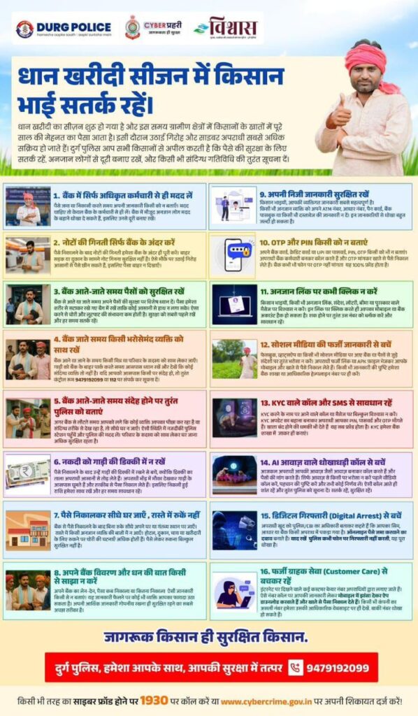 धान खरीदी सीजन में किसानों के बैंक खातों में बड़ी राशि आती है, जिसके चलते उनके साथ धोखाधड़ी और अपराध की आशंका बढ़ जाती है। इसी को देखते हुए दुर्ग पुलिस ने किसानों को आर्थिक सुरक्षा के लिए कई महत्वपूर्ण सावधानियां बरतने की सलाह दी है।