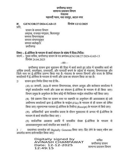 रायपुर ,12 दिसंबर (वेदांत समाचार)। छत्तीसगढ़ सरकार ने राज्य के सभी शासकीय दफ्तरों में एक जनवरी 2026 से पूरी तरह ऑनलाइन काम शुरू करने का फैसला लिया है। इस तारीख से फाइलों और नोटशीट का आदान-प्रदान केवल ई-ऑफिस के जरिए होगा। सामान्य प्रशासन विभाग ने विभागाध्यक्षों, संभाग आयुक्तों और सभी कलेक्टरों को इस संबंध में पत्र भेज दिया है।