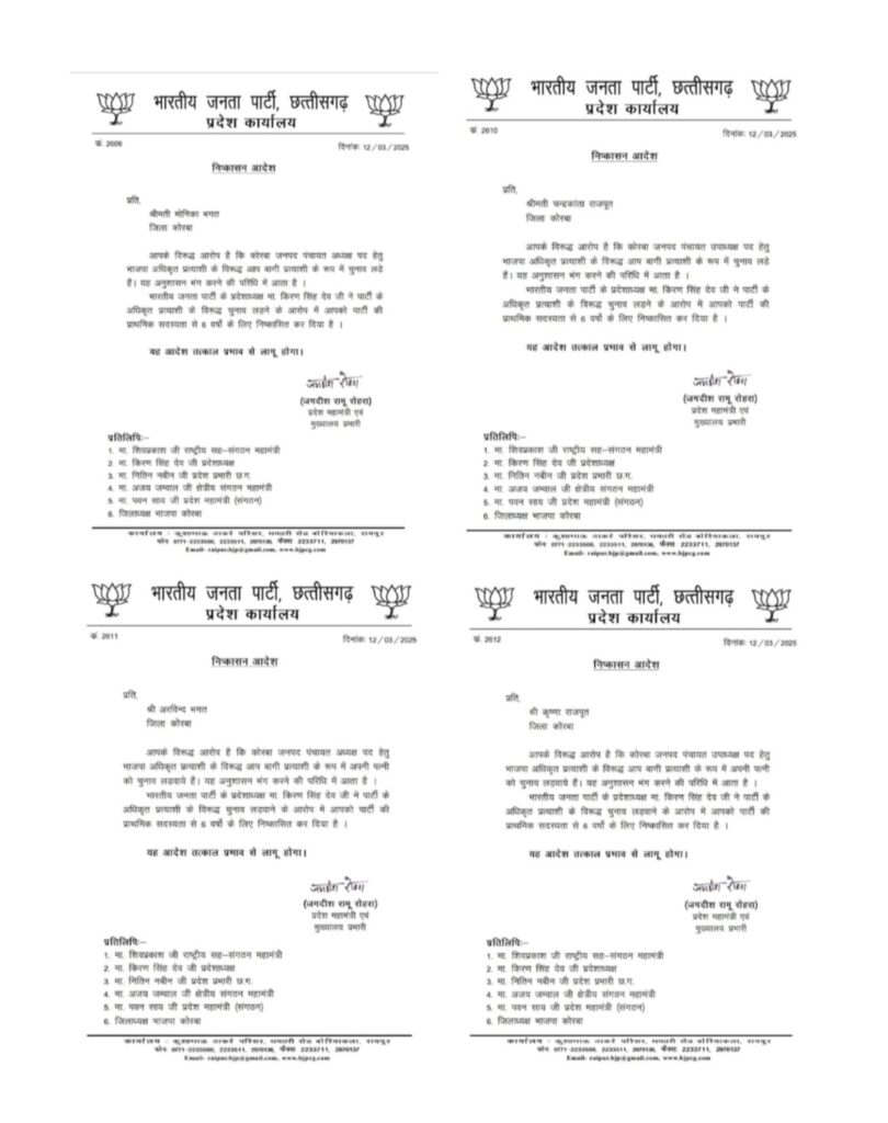 भाजपा के प्रदेशाध्यक्ष किरण सिंह देव के निर्देश पर प्रदेश महामंत्री जगदीश राम रोहरा ने यह आदेश जारी किया। यह फैसला भाजपा में अनुशासन कायम रखने के लिए लिया गया है।