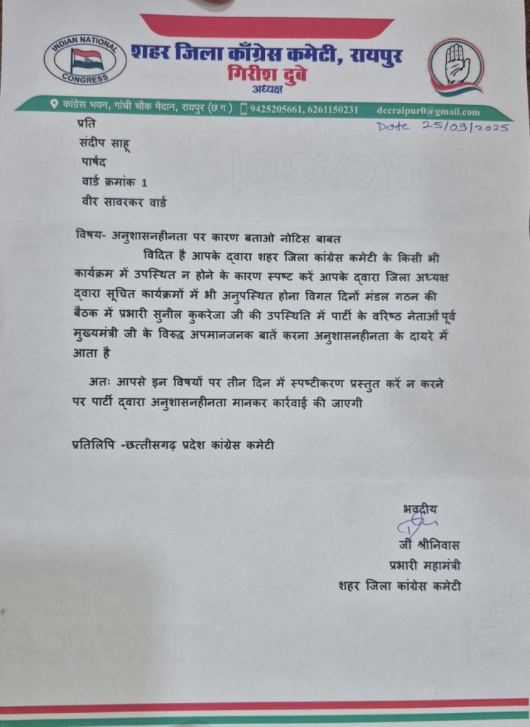रायपुर, 25 सितम्बर  कांग्रेस पार्टी ने पार्षद संदीप साहू को कारण बताओ नोटिस जारी किया है। उन पर पूर्व मुख्यमंत्री भूपेश बघेल के खिलाफ अपमानजनक टिप्पणी करने का आरोप है। इसके साथ ही चार अन्य पार्षदों को भी नोटिस भेजा गया है। सभी को तीन दिन के भीतर जवाब देने के निर्देश दिए गए हैं। यह नोटिस शहर जिला कांग्रेस कमेटी रायपुर अध्यक्ष गिरीश दुबे ने जारी किया है।