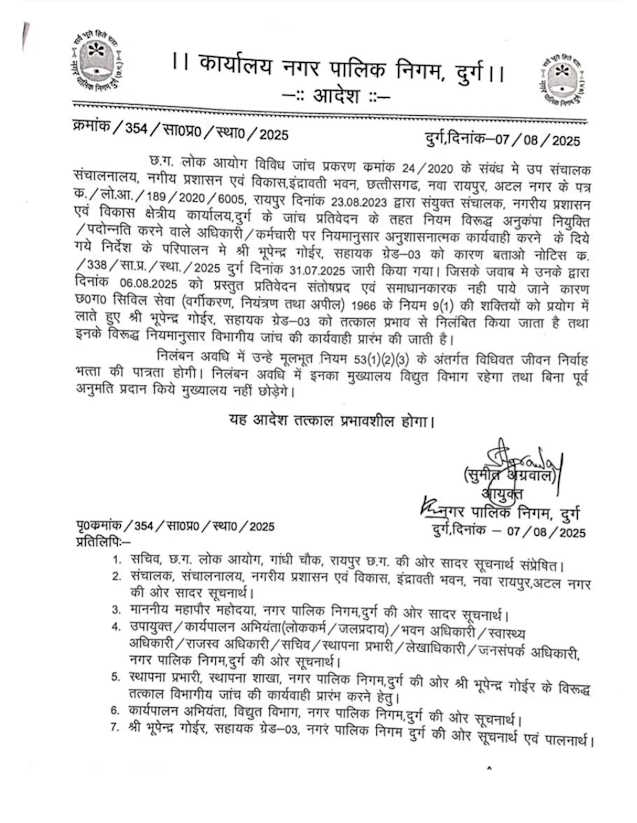 दुर्ग, 08 अगस्त (वेदांत समाचार)। नियम विरुद्ध अनुकंपा नियुक्ति के मामले में दुर्ग निगम आयुक्त सुमित अग्रवाल की कार्रवाई जारी है. ताजा घटनाक्रम में सहायक ग्रेड 3 भूपेंद्र गोइर को निलंबित कर दिया है. एक्शन मोड में नजर आ रहे दुर्ग निगम आयुक्त सुमित अग्रवाल ने भूपेंद्र गोइर को निलंबित करने से पहले सम्पत्ति कर वसूली में लापरवाही करने वाले राजस्व विभाग के 16 कर्मचारी-अधिकारी की सैलरी रोकने का आदेश दिया था.