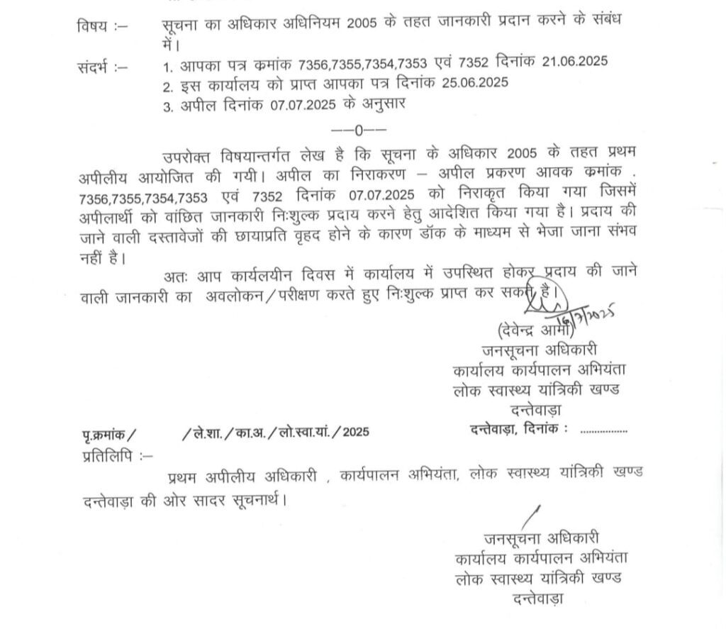 लेकिन जन सूचना अधिकारी सहायक अभियंता (एसडीओ)को निर्धारित मियाद 30 दिवस के उपरांत 31 वें दिवस में पत्राचार करना भारी पड़ गया। आवेदक ने उक्त नियमों के प्रतिकूल पत्र को प्रथम अपील में चुनौती दी। जिसे प्रथम अपीलीय अधिकारी कार्यपालन अभियंता लोक स्वास्थ्य यांत्रिकी विभाग ,जिला -दक्षिण बस्तर दन्तेवाड़ा ने दिनांक 07 /07/2025 को गूगल मीट के माध्यम से आयोजित सुनवाई में स्वीकार कर जनसूचना अधिकारी को एक सप्ताह के भीतर उपरोक्त जानकारी अपीलार्थी को निःशुल्क उपलब्ध कराने का आदेश पारित किया था। जन सूचना अधिकारी के लिए यह आदेश किसी झटके से कम नहीं था,उन्होंने इसकी तनिक भी कल्पना नहीं की थी कि उनका वृहद शुल्क का लेखकर आवेदक को जानकारी प्राप्त करने के लिए विचलित करने का दांव उन पर ही उल्टा बैठ जाएगा। 56 हजार 653 पृष्ठ की जानकारी का व्यय भार प्रति पृष्ठ 2 रुपए की दर से 1 लाख 13 हजार 306 रुपए का शुल्क उन्हें स्वयं वहन करना पड़ेगा।
