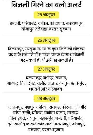 29 अक्टूबर को भी बीजापुर और दंतेवाड़ा में ऑरेंज अलर्ट जारी किया गया है। यहां बिजली गिरने के साथ भारी बारिश की संभावना है। साथ ही कांकेर,कोंडागांव नारायणपुर, बस्तर,सुकमा, रायपुर, बलौदाबाजार, महासमुंद, धमतरी, गरियाबंद, जशपुर, कोरबा, जांजगीर-चांपा, रायगढ़ में में यलो अलर्ट जारी किया है। इस दौरान गरज-चमक के साथ बिजली गिरने की संभावना है।