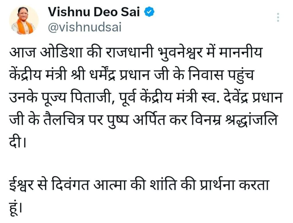 मुख्यमंत्री श्री साय ने कहा कि स्वर्गीय देवेंद्र प्रधान जी एक दूरदृष्टा राजनेता, कुशल संगठनकर्ता और जनसेवा के प्रति समर्पित व्यक्तित्व थे। उनका योगदान सदैव स्मरणीय रहेगा।