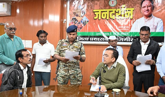 जनदर्शन में आज तहसील नवागढ़ के ग्राम तुलसी निवासी श्रीमती लीला मधुकर द्वारा राशन कार्ड से संबंधित, तहसील जांजगीर के ग्राम पेण्ड्री निवासी श्रीमती पुनीबाई द्वारा प्रधान मंत्री आवास योजना का लाभ दिलाने, चांपा के बजरंगी चौक मेहर पारा निवासी श्रीमती सत्यभामा देवांगन द्वारा पेंशन दिलाने, ग्राम मरकाडीह निवासी अरविन्द कुमार द्वारा पीएम किसान सम्मान निधि योजना संबंधी आवेदन प्रस्तुत किये। कलेक्टर जन्मेजय महोबे ने सभी आवेदनों को गंभीरता से लेते हुए संबंधित अधिकारियों को निर्देशित किया कि प्रत्येक आवेदन का समयबद्ध निराकरण सुनिश्चित किया जाए।