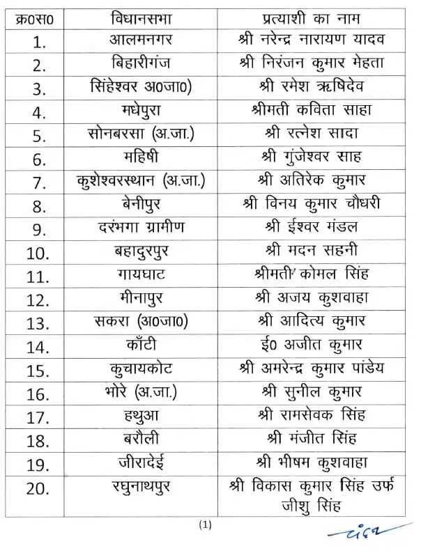 हालांकि इस लिस्ट में एक भी मुस्लिम चेहरे नहीं हैं. पार्टी की तरफ से पहले लिस्ट में किसी भी मुस्लिम को टिकट नहीं दिया गया है. महनार से उमेश कुशवाहा को उम्मीदवार बनाया गया है.