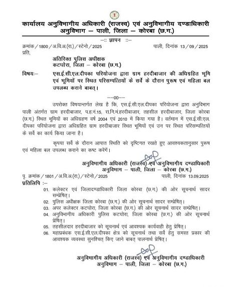 अनुविभागीय अधिकारी (राजस्व) एवं अनुविभागीय दंडाधिकारी पाली द्वारा 13 सितम्बर को जारी ज्ञापन में स्पष्ट लिखा गया है कि वर्ष 2004 और 2010 में SECL द्वारा अधिग्रहित ग्राम हरदीबाजार की जमीनों एवं उन पर बनी परिसंपत्तियों का सर्वे कराया जाएगा। इस दौरान “आपात स्थिति की आशंका” जताते हुए अतिरिक्त पुलिस अधीक्षक कटघोरा से पुरुष एवं महिला बल की माँग की गई है।