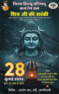 सुरेंद्र ठाकुर कोरबा/जमनीपाली, 27 जुलाई – विश्व हिन्दू परिषद और बजरंगदल के संयुक्त तत्वाधान में पवित्र सावन मास के तीसरे सोमवार 28 जुलाई 2025 को शाम 4 बजे देवों के देव महादेव की भव्य झांकी अयोध्यापुरी हनुमान मंदिर से प्रारंभ होगी ।नगर के प्रमुख मार्गों से होते हुए साडा कालोनी शिव मंदिर में विधिवत पूजा अर्चना के साथ इसका विधिवत समापन होगा।कोरबा महानगर संयोजक निहाल लाल ने सभी सनातनियो एवं शिवभक्तों को इस पुनीत कार्य मे सम्मलित होने की अपील की है।