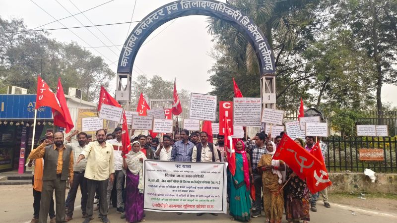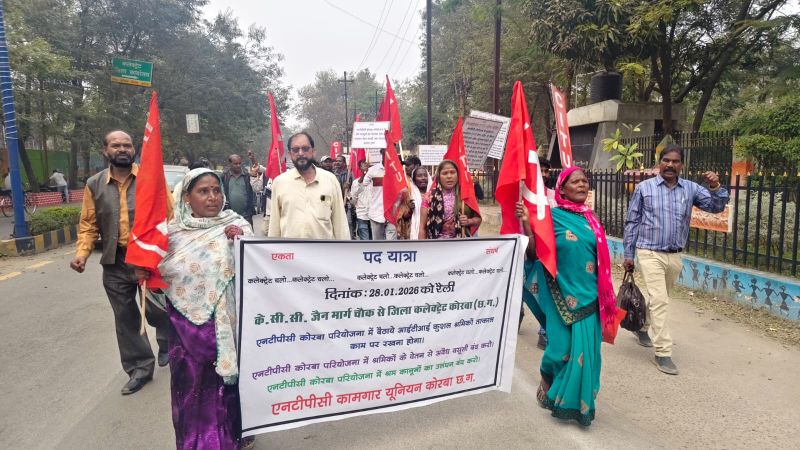 कोरबा,28 जनवरी 2026। एनटीपीसी कोरबा में कार्यरत ठेका श्रमिकों की विभिन्न समस्याओं को लेकर बुधवार को सीटू के नेतृत्व में एनटीपीसी परिसर से कलेक्ट्रेट तक पदयात्रा निकाली गई। पदयात्रा कलेक्ट्रेट पहुंचकर प्रदर्शन में तब्दील हो गई, जहां ठेका श्रमिकों ने अपनी मांगों के समर्थन में कलेक्टर के नाम ज्ञापन सौंपा।