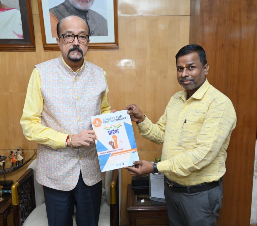 रायपुर, 09 अक्टूबर 2025 I राज्यपाल रमेन डेका को आज राजभवन में ‘‘सोसाइटी फॉर एम्पावरमेंट‘‘ द्वारा प्रकाशित मासिक पत्रिका ‘‘प्रारंभ‘‘ की प्रति भेंट की गई। विशेष पिछड़ी जनजातियों पर केंद्रित इस विशेषांक का संपादन मानवविज्ञानी एवं राज्यपाल के उप सचिव डॉ. रूपेन्द्र कवि द्वारा किया गया है।