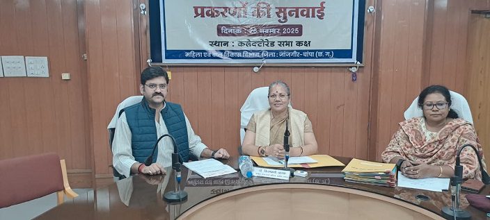 जांजगीर-चांपा, 26 नवम्बर 2025। छत्तीसगढ़ राज्य महिला आयोग की अध्यक्ष डॉ. किरणमयी नायक ने आज कलेक्ट्रोरेट सभाकक्ष में महिला उत्पीड़न से संबंधित प्रकरणों की जनसुनवाई की। यह प्रदेश स्तर की 352वीं तथा जिले में 13वीं सुनवाई रही। जनसुनवाई में महिला उत्पीड़न, वेतन भुगतान, फर्जीवाड़ा व न्यायालय आदेश के पालन न होने से जुड़े मामलों पर सुनवाई की गई। इस दौरान विधायक अकलतरा राघवेन्द्र कुमार सिंह भी उपस्थित रहे।
