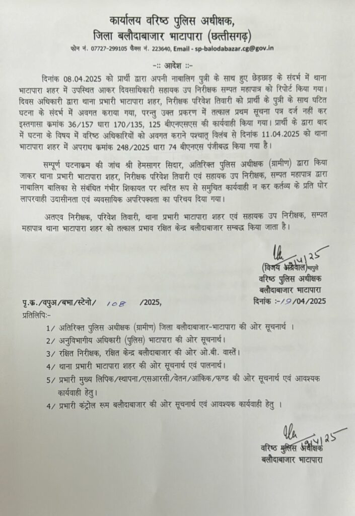 इस संबंध में जारी आदेश के मुताबिक के मुताबिक बीते 8 अप्रैल 2025 को प्रार्थी द्वारा अपनी नाबालिग पुत्री के साथ हुए छेड़छाड़ के संदर्भ में थाना भाटापारा शहर में उपस्थित आकर दिवस अधिकारी सहायक उप निरीक्षक सम्पत महापात्र को शिकायत की गई। दिवस अधिकारी द्वारा थाना प्रभारी भाटापारा शहर, निरीक्षक परिवेश तिवारी को इस घटना के संदर्भ में अवगत कराया गया, परन्तु उक्त प्रकरण में तत्काल प्रथम सूचना पत्र दर्ज नहीं कर इस्तगासा क्रमांक 36/157 धारा 170/135, 125 BNSS (भारतीय नागरिक सुरक्षा संहिता) के तहत आरोपी के खिलाफ केवल प्रतिबंधात्मक कार्यवाही की गई।