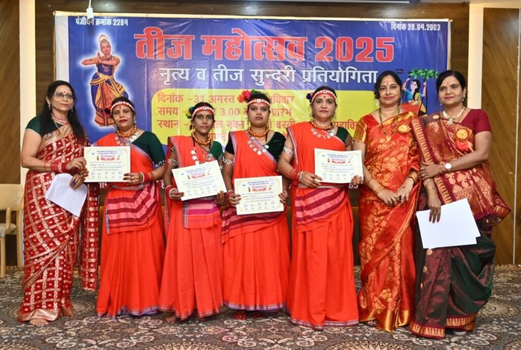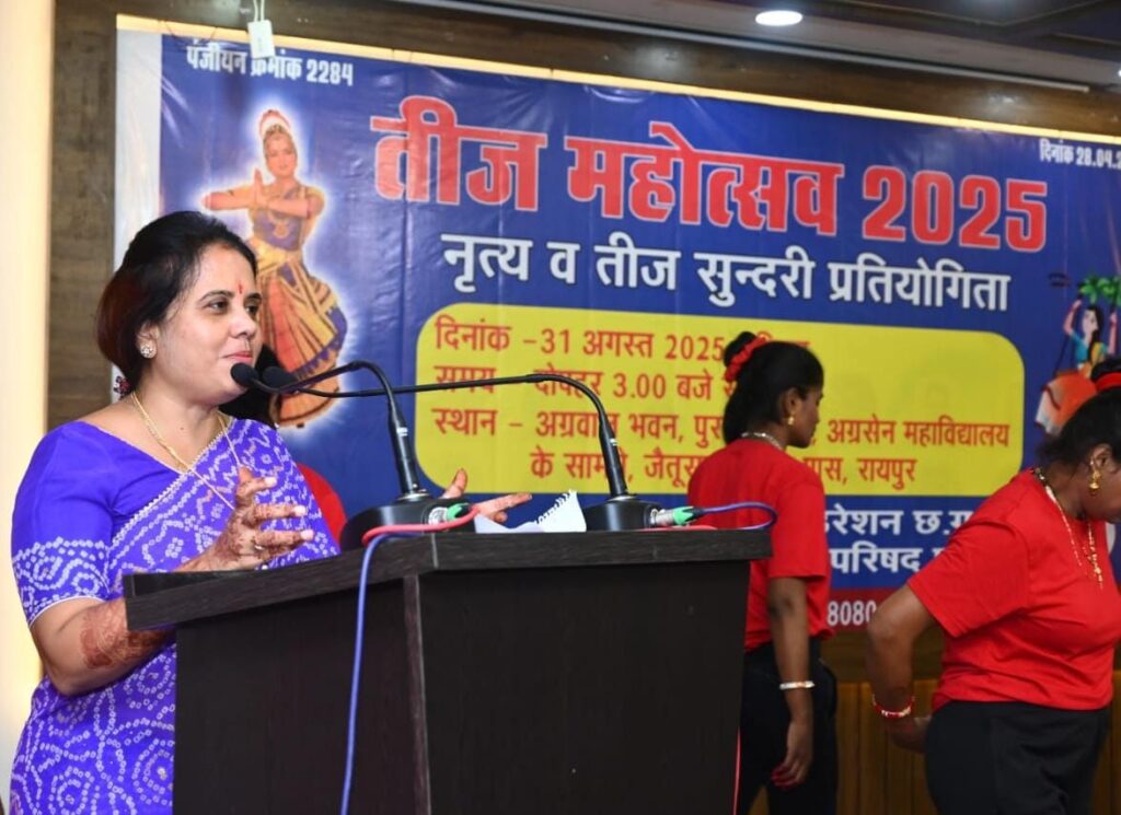 रायपुर, 01 सितंबर (वेदांत समाचार)। वर्ल्ड ब्राह्मण फेडरेशन छ.ग. एवं सर्व युवा ब्राह्मण परिषद छ.ग. द्वारा विगत वर्षों की भाँति प्रदेश की विप्र महिलाओं, युवतियों को पूर्णतः सांस्कृतिक मंच प्रदान करने के लिए “तीज महोत्सव” का आयोजन अग्रवाल भवन, पुरानी बस्ती में किया गया. प्रतिभागियों ने समूह, एकल नृत्य, युगल नृत्य तीज सुंदरी की प्रस्तुति दी. कार्यक्रम की मुख्य अतिथि महापौर श्रीमती मीनल चौबे एवं विशेष अतिथि राज्य बाल संरक्षण आयोग अध्यक्ष श्रीमती वर्णिका शर्मा रहीं. अतिथियों ने माँ सरस्वती के चित्र पर माल्यार्पण, दीप प्रज्जवलन, वंदना कर कार्यक्रम का शुभारम्भ किया. पदाधिकारियों द्वारा अतिथियों का पुष्प गुच्छ एवं स्मृति चिन्ह प्रदाय कर स्वागत किया गया.