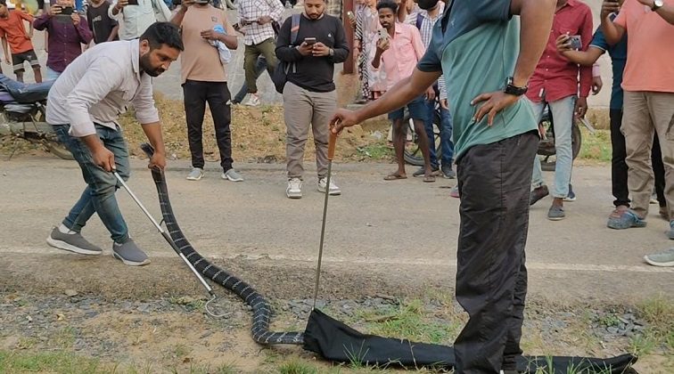 कोरबा,24 सितम्बर (वेदांत समाचार) । कोरबा जिला अपनी समृद्ध जैव-विविधता और दुर्लभ वन्यजीवों के लिए जाना जाता है। यहां कई बार ऐसे जीव देखने को मिलते हैं जिनसे आम लोग चकित रह जाते हैं। इसी कड़ी में जिले के अजगरबाहर गांव में एक ऐसी घटना घटी , जिसमें मानव और जीवों के बीच प्रेम भावना दिखी, दरअसल कोरबा जिले के सतरेंगा पर्यटन स्थल से लौट रहे कुछ पर्यटको की नजर अजगरबहार गांव के पास एक 10 फीट का किंग कोबरा रोड पार कर ही रहा था उस पर पड़ी और पर्यटकों ने तत्काल गाड़ी रोक दी,देखते ही देखते भीड़ इकट्ठा हो गई वही किंग कोबरा रोड पार न कर के डर से एक किनारे एक छोटी सी झाड़ी में छुप कर बैठ गया, लोगों में देखने की जिज्ञासा से लगातार भीड़ बढ़ने लगा किंग कोबरा एवं लोगों की सुरक्षा को ध्यान में रखते हुए,घटना की जानकारी तत्काल वन विभाग और नोवा नेचर वेलफेयर सोसायटी की टीम को दी गई। सूचना मिलते ही रेस्क्यूअर जितेंद्र सारथी ने मामले की जानकारी डीएफओ कुमार निशांत को दिया फिर उनके निर्देशानुसार और एसडीओ आशीष खेलवार एवं सुर्यकांत सोनी के मार्गदर्शन में जितेंद्र सारथी अपनी टीम के साथ तुरंत उस स्थान के लिए रवाना हुए। गांव पहुंचने के बाद सबसे पहले पर्यटकों एवं ग्रामीणों को सुरक्षित दूरी पर किया गया और फिर तय प्रोटोकॉल के तहत रेस्क्यू अभियान शुरू किया गया।