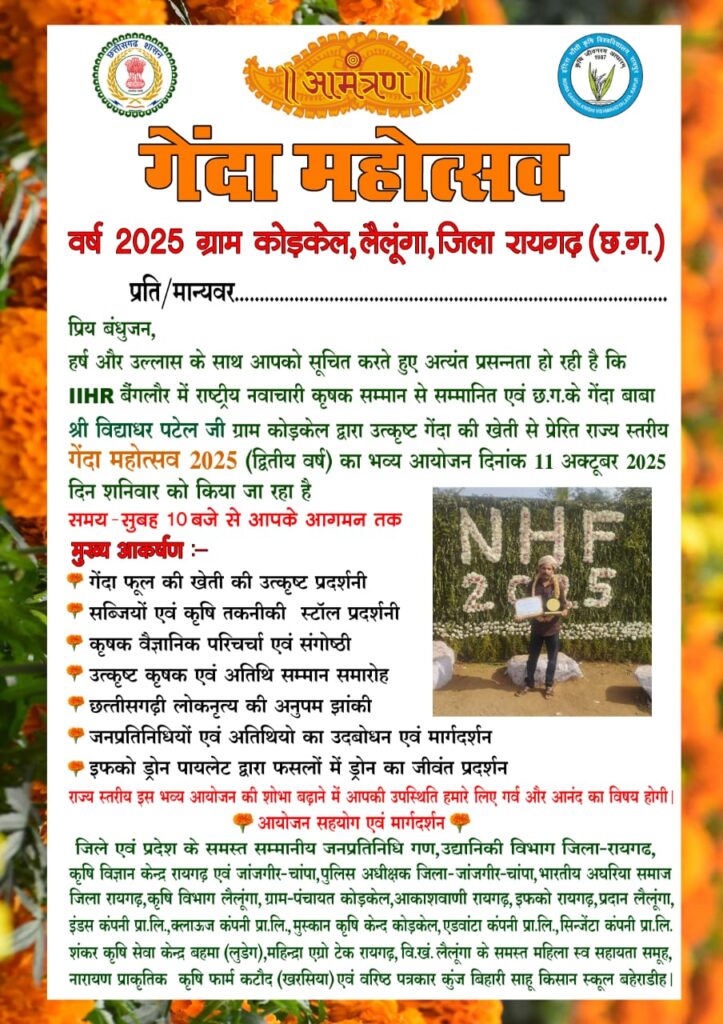यह महोत्सव रायगढ़ जिले के लैलूंगा क्षेत्र के ग्राम कोड़केल में आयोजित किया जा रहा है, जिसमें प्रतिभागियों को गेंदा की खेती से जुड़े व्यावसायिक पहलुओं की जानकारी दी जाएगी।