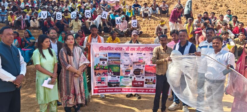 रायपुर 18 जनवरी 2026 । आदिवासी बहुल एवं कृषि आधारित आजीविका वाले जिले मोहला मानपुर अम्बागढ़ चौकी की ग्राम पंचायत करमरी में सोमवार को वीबी जी राम जी (विकसित भारत गारंटी फ़ॉर रोजगार एंड आजीविका मिशन- ग्रामीण) के अंतर्गत जागरूकता कार्यक्रम का आयोजन किया गया। इस कार्यक्रम ग्रामीणों द्वारा मानव श्रृंखला बनाकर ‘आत्मनिर्भर गांव – विकसित भारत’ का संदेश दिया गया। इस दौरान योजना के प्रति उत्साह और सामुदायिक सहभागिता स्पष्ट रूप से देखने को मिली।